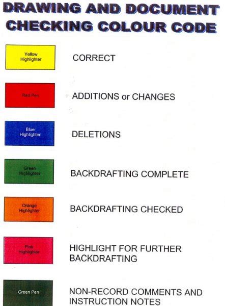 The only color coding i've worked with is that right now where i'm at does do color coding by markup order. Markups are typically incorporated into cad drawings, such as. The engineer will use a red pen to indicate all changes that are to be added to the drawing, a green pen to indicate all items to be removed, and a blue pen to make general comments that do not get added to the drawing. That is why the engineer prints, reviews, and returns a new markup.
